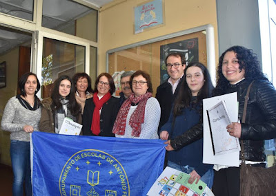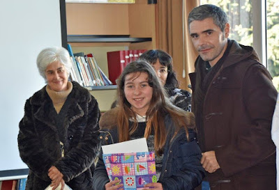 | A Carolina Neves, vencedora do passatempo, vê reconhecido o seu empenho junto do diretor de turma, o Professor Paulo Gonçalves, e da Professora de EV, Teresa Roby, dinamizadora do Passatempo. |